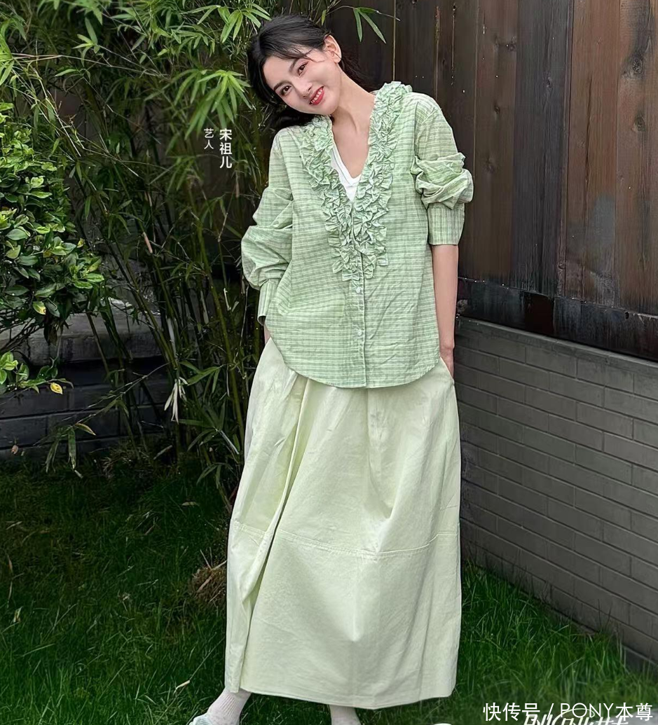 绿色设计感上衣+绿色半身裙,绿意盎然!春天穿绿色可太清新明媚了。宋祖儿一身绿色系穿搭,给人带来春日的清新感!首先是绿色格纹衬衫设计,v领设计和点缀的立体荷叶边领口设计,不仅甜美而且显白显脸小。她巧妙搭配白色v领吊带,更显脖颈修长,让人眼前一亮。